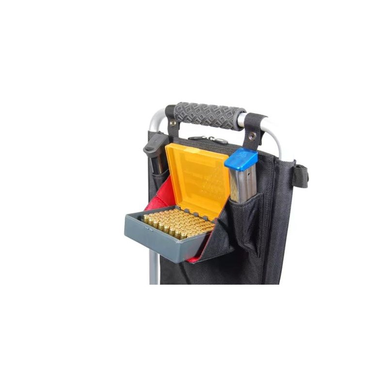 El respaldo de tela D1000 es tan funcional como atractivo. En la parte superior delantera, ubicada en una posición elevada para facilitar el acceso estando de pie, se encuentra una bandeja plegable para munición, en la que puede colocar 100 cartuchos y cargar sus cargadores cómodamente. ¡Una característica ideal para aquellos campos de tiro sin mesas! Junto a esta bandeja plegable hay un par de bolsillos adicionales para cargadores, para mayor comodidad.