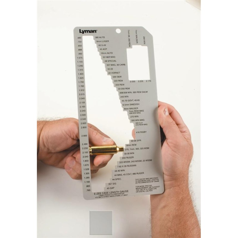 Esta versión mejorada muestra las medidas de vaina de los cartuchos mas populares de rifle y pistola. Muchos nuevos cartuchos son incluidos como el 204 Ruger, 500 S & W y otros. Este medidor de metal resistente hace que la clasificación de las vainas se rápida, fácil y precisa.
