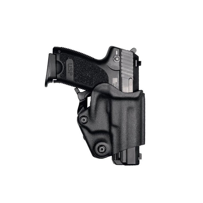 Este modelo ha sido diseñado para aquellos que quieren una funda compacta para llevar pistolas grandes, con doble sistema de seguridad. De esta manera las armas pueden ser colocadas y extraídas de la funda fácilmente. Fabricado en polímero de alta resistencia.