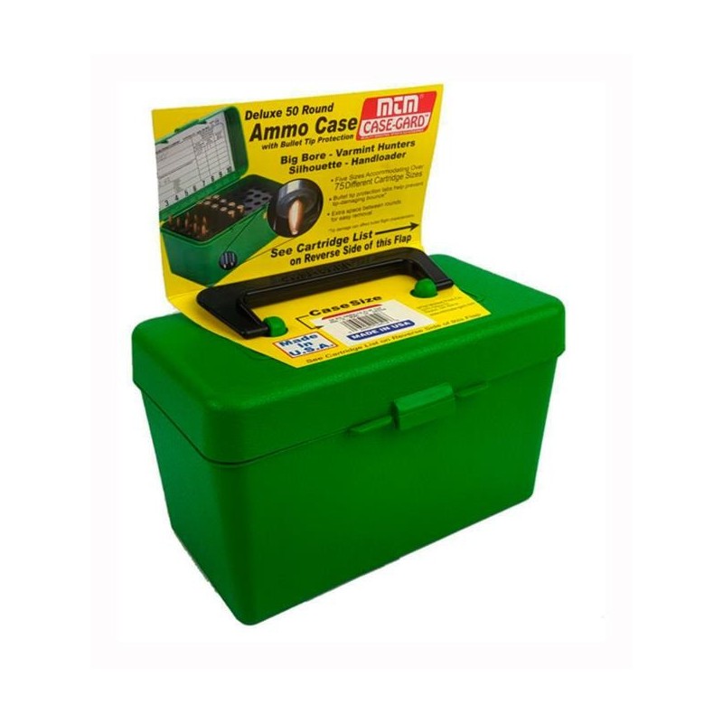 Caja portamunición fabricada en plástico de alta resistencia. Está diseñada de tal manera que al colocarse boca abajo, la punta no sea dañada. Tiene un asa de transporte plegable y broche por presión. Espacio extra entre cartuchos para facilitar la extracción con guantes.