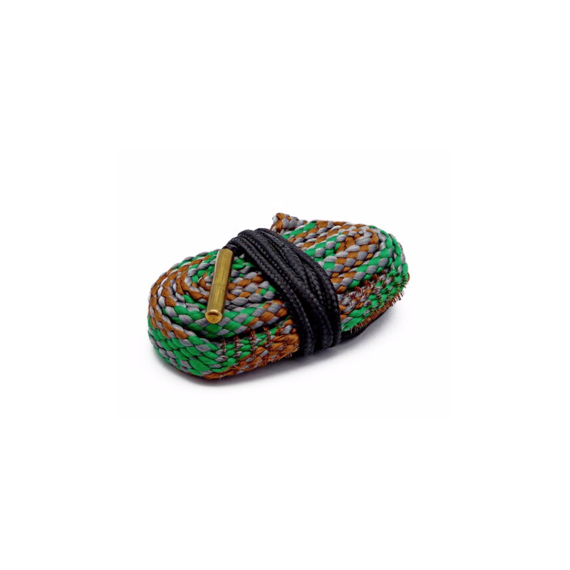 Simplemente baje el extremo lastrado por el cañón, desde la recámara hasta la boca, y tire de él. Hágalo con o sin disolvente, según sus necesidades. Con un solo tirón, pase un cepillo de cerdas de cobre y un hisopo ancho y largo por todo el cañón. ¡Ni siquiera tiene que desmontar el arma para limpiarla! Se completa en segundos y su cañón estará listo para otra sesión en el campo de tiro o en el campo.