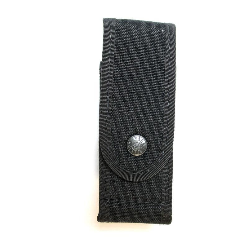 - Funda de cordura con cierre de corchete para guardar su cargador de arma corta y llevarlo en su cinturón de servicio.