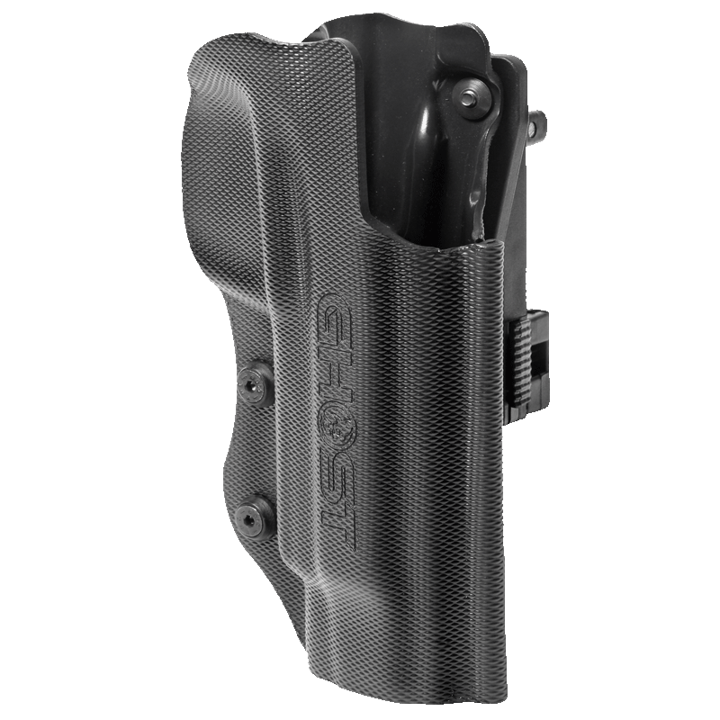 Se incluyen anclajes de cinturón alto apto para cinturones de 3,5-5 cm y paddle. El anclaje tipo paddle permite el uso de la funda sin cinturón.