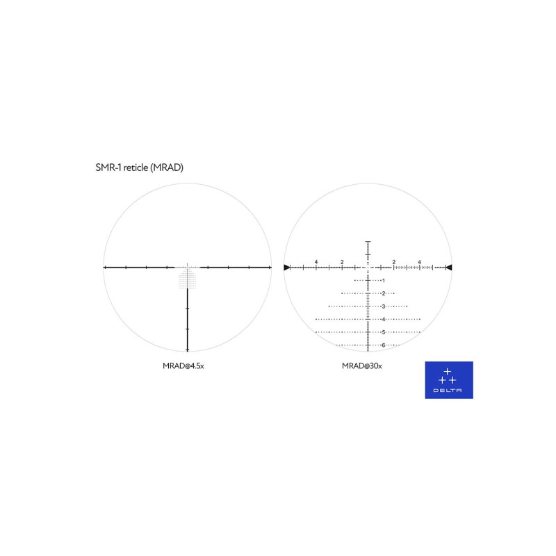La SMR-1 es una red táctica hecha para las necesidades de los tiradores de largo alcance y los jugadores de PRS , pero gracias al centro iluminado, la red también es ideal para cazar con poca luz. La retícula se caracteriza por un campo superior limpio, un punto central flotante, marcadores de 0.2MRAD y una regla integrada vertical y horizontalmente con marcadores de 0.1 MRAD para facilitar la medición del objetivo. La parte del «árbol de Navidad» tiene marcadores de 0,2 MRAD para la medición de distancias, la medición de la deflexión del viento y fines derivados. Los números para medir haces consecutivos se colocan 1,2 MRAD a la derecha del centro para que se puedan ver fácilmente al contar los haces, pero aún lo suficientemente lejos del centro para no cubrir el objetivo en los puntos más críticos de la malla.